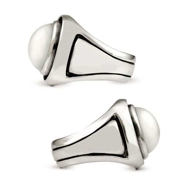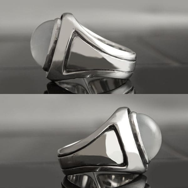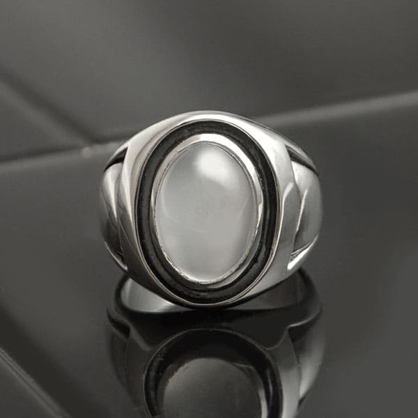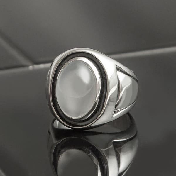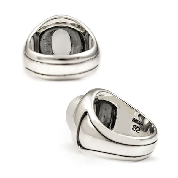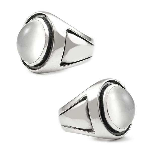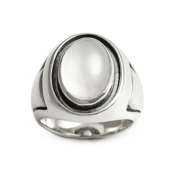 シンプルなデザインの中に大きなムーンストーンがセットされたシルバーリングです。つややかなムーンストーンがやさしいイメージを与えてくれるので、ボリュームがありますがしっくりと指になじみます。